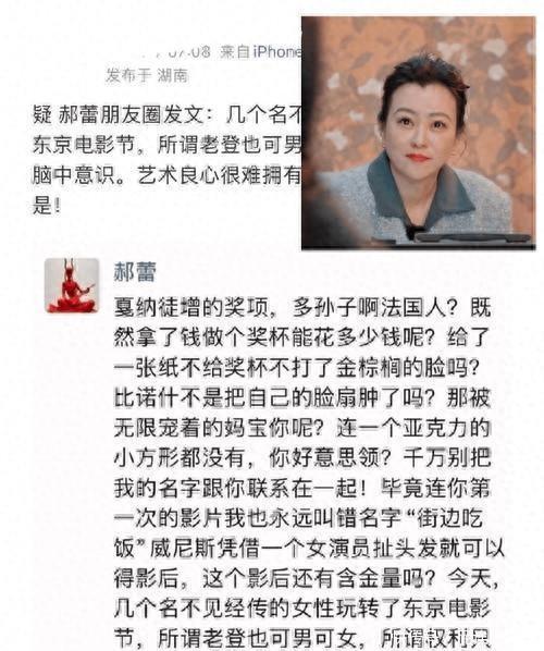 一条疑似郝蕾的朋友圈,让娱乐圈掀起了一场关于国际电影节公正性的轩然大波。这位以敢说敢言著称的老戏骨,直指戛纳、威尼斯、东京三大国际电影节存在暗箱操作,既讽刺戛纳临时增设的特别奖是“拿钱办事”,仅给纸质奖状而非正规奖杯,又质疑威尼斯影后“靠扯头发获奖”,暗指辛芷蕾的荣誉缺乏含金量,更点出东京电影节被少数人操控的乱象,言辞犀利地戳破了行业的体面。